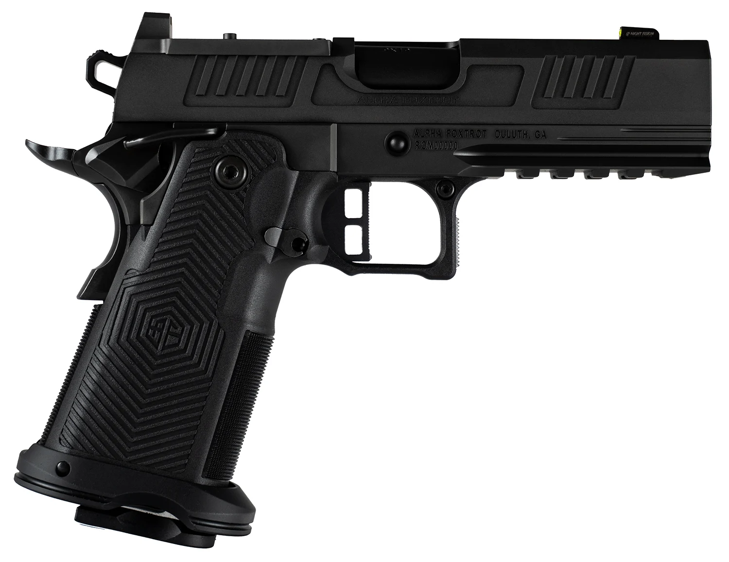 The AF1911 Romulus delivers full-size performance with Alpha Foxtrot’s modern 2011-style engineering. Featuring a black polished DLC finish on the frame and slide; Bull barrel; Night Fision sight; Picatinny rail; ambidextrous thumb safety; flared magwell and is RMSC/RMR optics cut. Includes MOS adapter plate, RMSC and RMR plate, 17rd and 20rd magaine.