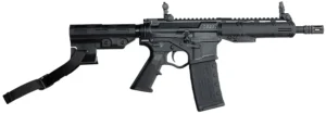 The UDP-9 Pistol is a compact AR-15 style firearm chambered in 9mm and fed with Glock magazines. It features last round bolt hold open; flared magwell; oversized trigger guard; no forward assist or dust cover; threaded bolt catch screw; 9mm bolt assembly for use with a standard AR-15 hammer; Mil-Spec AR-15/M4 Fire control group; 5.50″ free float ultra light M-LOK handguard and Mil-Spec 1913 Picatinny rail. The UDP-9 is compatible with most aftermarket 9mm PCC triggers. Accepts all Glock aftermarket magazines. We recommend using factory Glock magazines. Includes one 15rd magazine.