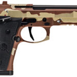The 92XI Combat series features the 92XI Single-Action Only (SAO) pistols. The 92XI brings frame mounted safety to the standard 92 family of products, as well as a single action only variant and various ergonomic enhancements. The frame mounted safety offers an ambidextrous solution, bringing the safety lever more in reach with natural ergonomics. The 92XI features the X-treme-S single action only and flat-faced trigger, performance DLC coated trigger components and a lightweight skeletonized hammer, allowing for a crisp trigger pull with the option to go cocked and locked. The 92XI carries forward the Vertec style frame, a fiber optic front sight for faster sight acquisition and the option for MRDS optics mounting making this a high performing, reliable choice for personal defense and competition. Each pistol is hand painted by veteran-owned company Howe Arms, which makes each pistol unique by having its own footprint. Chocolate chip is a nickname for the six-color desert camouflage pattern developed by the U.S. in 1971, used initially in the Sinai and most notably during Operation Desert Shield/Storm and in Somalia.