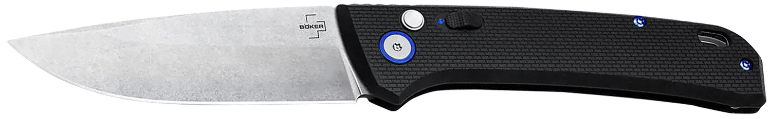 The Boker Plus FRND breaks free of the daily humdrum and invigorates as a varied and slim automatic knife with EDC character. The drop-point blade made of D2 opens by push button and has a gritty stonewash finish that makes small traces of use almost disappear even after hard use. The robust button lock with an additional slider doubly secures the blade during use and significantly minimises the risk of unruly cutting actions escaping. Accidental opening in a trouser pocket is also a thing of the past thanks to the safety catch. The textured Grivory handle scales provide a firm grip even in wet conditions and highlights the lightness of the pocket-knife. Decorative accents are set by the anodised screws and the blue-edged blade axle screw.