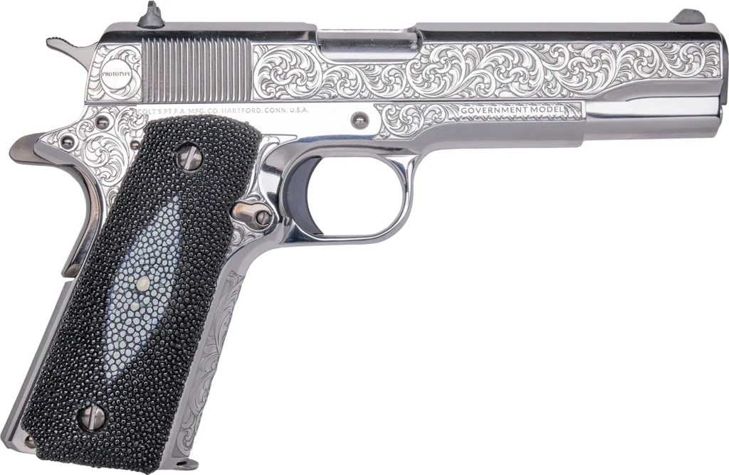 Cnc Firearms CNCTUX38 Colt 1911 Tuxedo 38 Super 9+1 5″ Stainless Steel Barrel, High Polished w/Black DLC Engraving Stainless Steel Serrated Slide & Frame, Stingray Grip