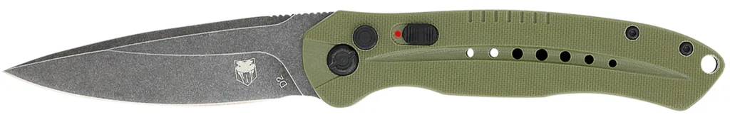 The Diablo is a side button folding automatic. It comes equipped with G-10 scales and a black stonewash D2 steel blade. Has a sliding safety switch to prevent accidental discharge.