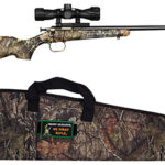 Crickett’s Crickett Synthetic Rifle has a manual cocking single-shot bolt action. It features a rebounding firing pin safety, adjustable rear peep sight and a fixed front, synthetic stock, and a drilled and tapped receiver. This model features a blued barrel and a Mossy Oak Break-Up camo stock. It comes with a scope, mount and designer gun case.