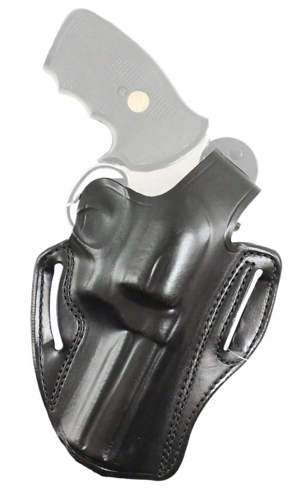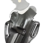 This holster allows the firearm to ride high and be presented at an optimum draw angle. Its thumb break and exact molding, together with a tension device, allows for a secure and highly concealable OWB carry. Belt slots are 1 3/4″ wide. This picture illustrates the three-slot model. Holster is available in black or tan leather, with or without suede lining, plain or basket-weave finish. Fits S&W Shield X With or Without Red Dot.