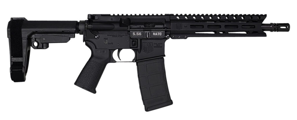 This DB15 Pistol features a carbine-length, medium, 4150 ChromeMoly barrel, pistol-length gas system, and a shot-peened Mil-Spec 8620 bolt carrier. It has 7075-T6 aluminum receivers, 9″ M-Lok handguard, Magpul MOE grip, and a SBA3 brace.
