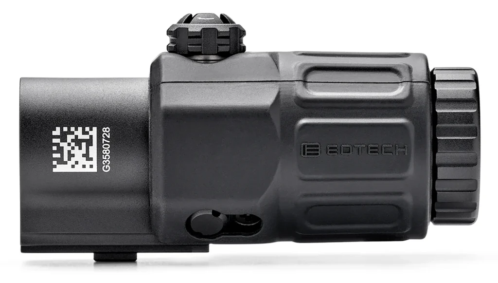 The G33 Magnifier is the selected magnifier of USSOCOM, and is compact and lightweight. The mount provides fast transitioning from 3X to 1X, and the optic offers tool-free vertical and horizontal adjustments, larger field-of-view and an adjustable diopter for improved, precise focusing. The G33 works with all EOTECH HWS models.