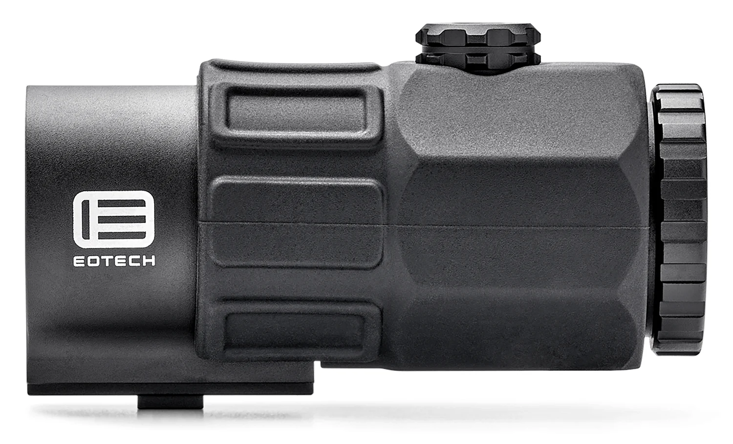 The G45.STS mini 5X Magnifier has the similar weight and dimensional properties as the existing G33 Magnifier, but with an additional 2X magnification for precision aiming at greater distances. The mount provides fast transitioning from 5X to 1X and the optic offers tool free vertical and horizontal adjustments with a large field-of-view. The G45 is compatible with all EOTECH HWS models.