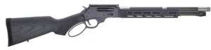 A symbol of American Pride, this unique Henry Trucker’s Tribute Edition is a testament to America’s appreciation for truckers and their families. This rifle features a traditional octagonal barrel, outfitted with classic fully adjustable buckhorn sights. On the right side of the rifle is an image of an eastbound 18-wheeler moving commodities across the country and the left side features a convoy of trucks heading west. Heidi Roos hand engraved the 24K gold banners that read Truckers Move America and Bound for Glory respectively. The .22 LR’s tubular magazine holds 16 rounds of .22LR and 21 rounds of short. Rifles come drilled/tapped for easy scope mount installation and include a brasslite barrel band.