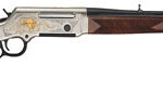 The Long Ranger Wildlife Elk edition is centered around an eye-catching lightweight alloy receiver plated with highly polished nickel that depicts a majestic bull elk in a mountain setting on its left, and a grazing pair on its right flat and lightly accented with 24 K gold inlay. Rear sight is folding fully adjustable, front sight is ramp w/.062″ Ivory bead, drilled and tapped for scope. It utilizes a walnut stock with black solid rubber recoil pad. Includes swivel studs and removable magazine.