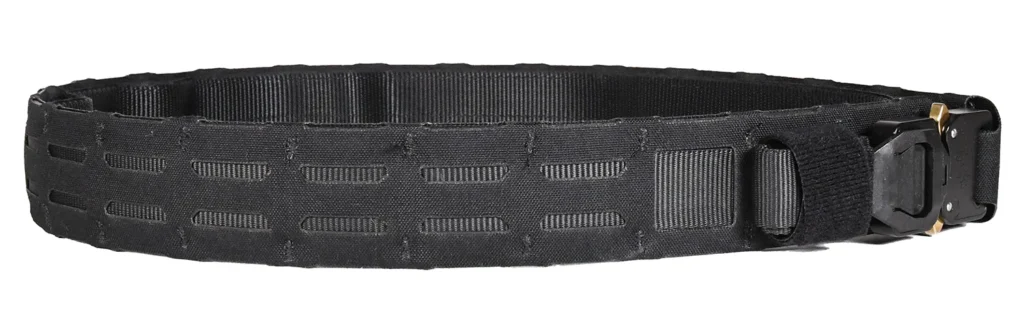 The Operator belt features Cobra buckle with Snakebite fitting to secure webbing tail and prevent possible snagging; 1″ Mil-Spec 5625 tubular nylon webbing with water-repellant coating to withstand the elements; Thermoplastic core provides long-term rigidity without adding weight; Laser-cut MOLLE slits (abbreviated 3-row pattern) allow pouches to mount with MOLLE, belt loops or OneWrap straps and comprised of an inner and outer belt connected by hook and loop fastener. Compatible with virtually all holster and pouch mounting systems.