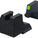 Heckler and Koch VP9, VP40, P30, HK45 Elevated Sight Set. Featuring a green dot front sight, this elevated sight set is designed for the HK VP9, VP40, P30, and HK45 model pistols. The contrast between the green dot front sight and matte-black rear sight sights allows for quick target acquisition. With a 0.462″ front sight height and 0.5655″ rear sight height, this iron sight set is elevated for use with a suppressor and/or optics sights.
