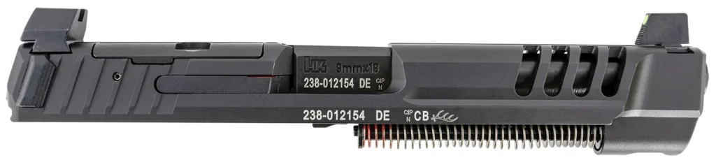 This optic ready slide is compatible with your HK VP9. The slide features tall sights and a slide cover.