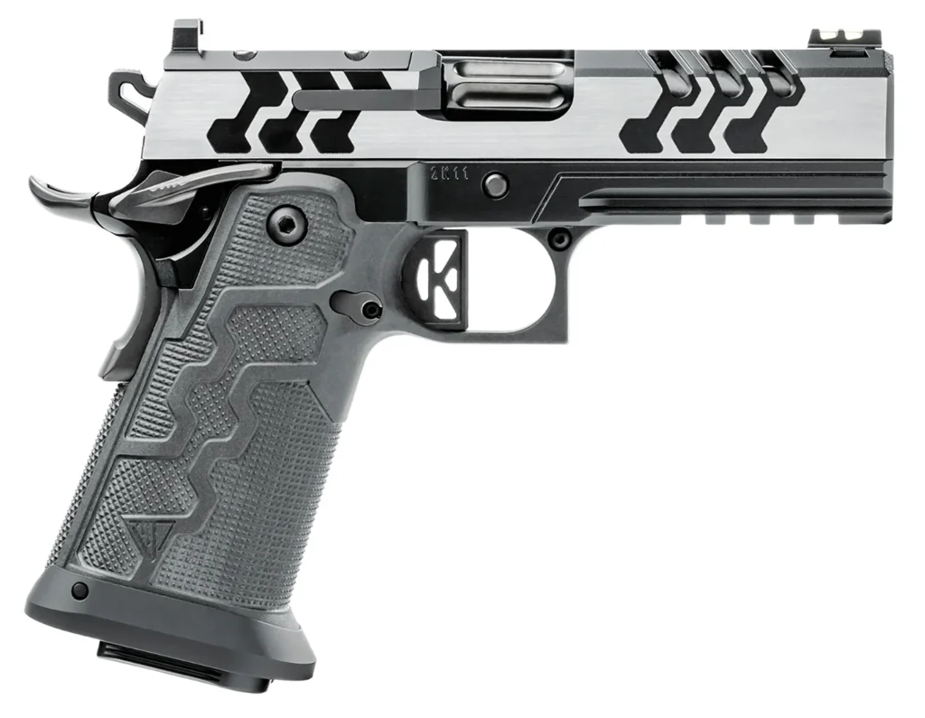 The Kimber 2K11 Pro with the patent pending tool-less guide rod, improved internal magazine geometry and external extractor and optics ready capability combine to deliver high capacity 1911 design. Featuring stainless steel slide, frame and barrel; accessory rail; Custom 2K11 front and rear serrations on slide; Stan Chen magwell; TAG Custom FiberLok 2 front sights and a fluted barrel. Includes a C&H Precision optics plate for the Trijicon RMR family, two 19rd magazines.