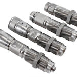 Designed for the tremendous volume of our Mark 7 presses, every aspect of these precision dies was carefully engineered for top performance. Of course, they work great in regular progressive presses as well as turret and single station presses. Our first consideration was the material of the dies. Our size, seat and crimp dies are all made of stainless steel which was chosen for its toughness and anti-corrosion qualities. No more rusted dies! Our sizing dies are equipped with highly polished carbide rings for the ultimate in wear resistance and reduced sizing force. In addition, the sizing dies are equipped with a spring-loaded decapping rod system to ensure that the primer is forcefully ejected from the primer pocket. Our rifle sets get our famous M die neck expander, with its famous two step expander plug for just the right amount of neck tension and case mouth flare. The pistol sets include our flare die which are designed to allow bullets to properly sit on the case mouth prior to seating. Next is our Micrometer Seating die. This seating die has a micrometer adjustable seating head for precision bullet seating length. Its floating bullet seating punch centers the bullet on the case and eliminates excessive run-out. Finally, each set is equipped with a taper crimp die (micrometer adjustable) to fully remove any case mouth flare and to provide improved bullet retention.