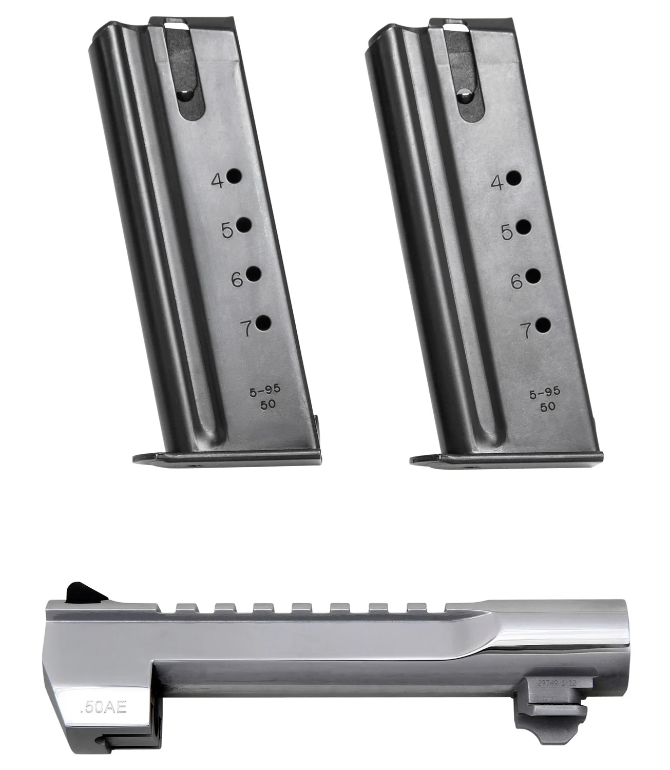 This Desert Eagle Mark XIX barrel features a polished chrome finish with an integrated top tail and sight. It comes with two (2) .50 AE magazines in a clamshell package.
