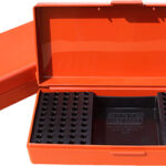 The SB-200 was not only designed for 22 rifle small bore competitors, but also for varmint hunters and plinkers. It will easily hold 100 rounds in the down position for easy access during competition. Space in the center is available which can hold two full 50 round boxes. The SB-200 features a Snap-lok latch and a fold-down handle for easy transporting to the field or range. Calibers: 250-rounds 22 Long Rifle, 22 Long or 17 Mach 2; 200-rounds of 22 Win. Mag. or 150-rounds of 17 HMR.