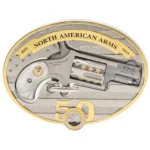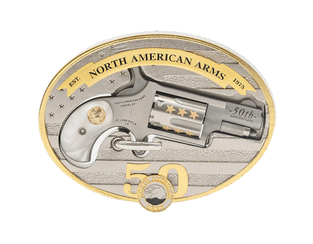 Mini-Revolvers by North American Arms feature a 1.13″ ported barrel. Features a lightweight concealed carry pocket gun with a 5 shot capacity; a half moon sight. The hammer may rest safely and securely away from live or empty chambers without chance of accidental discharge. Includes 50th Anniversary, oval, custom carry Ornate belt buckle with secure clip release. Fits belts 1″ to 1.50″ wide.