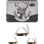 Give a gift that stands the test of time with the limited-edition Old Timer 3-Pc. Folding Knife Set with Gift Tin. This set features three classic pocket knives ideal for hunting camping and everyday carry each built to last and ready to tackle any task. Since 1958 Old Timer has crafted heirloom-quality knives that blend durability with timeless design and this collection is no exception. Each knife in this gift-worthy tin boasts 7Cr17MoV stainless steel satin-finished blades delivering sharp reliable performance in any situation.