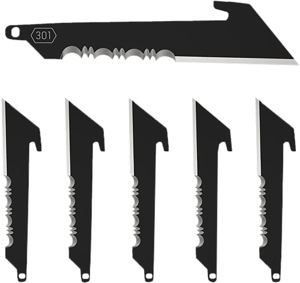 Set of six 3″ serrated utility replacement blades. Perfect for hunting, work and everyday carry. Each blade comes sealed in a plastic pouch with PVC blade cover to protect the blade from the elements and to improve safety when transporting and changing blades.