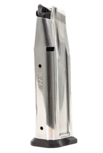 An extended blue-steel magazine holding 32-rd of 9mm ammunition for the Kel-Tec P-11 pistol. This magazine comes with a follower and bumper/base plate made of an impact-resistant black polymer material; and uses heat treated Chrome-silicon wire for reliable feeding and long spring life. The magazine has an o/a length of 9.25 inches. Made in the U.S.A.