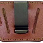 PSPI leather holster has belt slots to fit up to 1.75″ belt, with a removeable clip for wearing inside or outside waistband, right or left hand and can be worn in the small of the back. O36 Fits small to medium frame auto handguns such as .22, .25, .32, and .380 handguns, plus some smaller 9mm models.