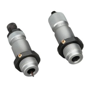 This two-die set is intended for reloading bottleneck cases and consists of a Full-Length Sizer Die with an Expander-Decapping Unit and a Seater Die with Bullet Seater Plug. The Full-Length Sizer Die brings the case to SAAMI minimum cartridge dimensions. It sizes the outside of the case de-primes and expands the neck to accept the bullet. The die has vents to prevent case damage caused by trapped air and for excessive lubricant. Headspace is held to minimum tolerances to avoid changing the case body length during full length sizing. The included Seater Die has a built-in roll crimper to secure the bullet at the same time as it
