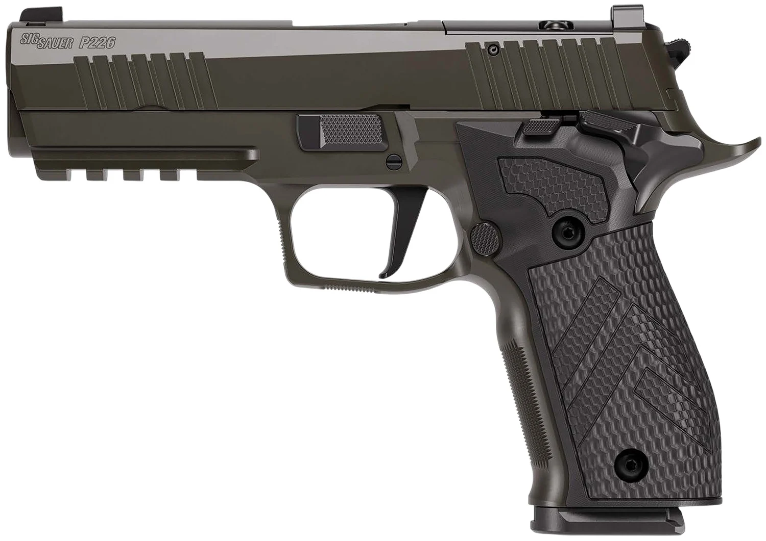 The P226X Legion offer enhanced ergonomics for superior comfort, flush-fit 18-round magazines for increased capacity, low profile decocker, G10 Legion Pattern grip panels by HOGUE and finely tuned adjustable trigger systems to adapt to your shooting style. Optic-ready for SIGLOC Pro, ROMEO1Pro, ROMEO2, DPP and RMR footprints. Compatible with X5 slides, controls, grips and trigger systems. Includes three magazines.
