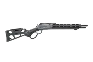 The S&W Model 1854 features traditional styling; walnut stock w/textured grip panels; large loop lever; extended rail on receiver for optics; gold bead front sights and XS Ghost ring rear sight; threaded barrel with thread protector.