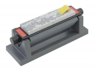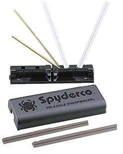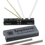 Spyderco’s Tri-Angle Sharpmaker includes two sets of high Alumina Ceramic 7″ stones: medium grit for aggressive sharpening and fine grit for professional-grade finishing. Stones fit into keyed holes and a set of brass safety rods protect the user’s hand during sharpening. The triangular shape allows honing of serrated and plain edges. Slots molded into the polymer base have a 40- and 30-degree angle for knives and a 12.5-degree scissor setting. A groove running the length of the stone is for sharpening pointed objects like darts, awls and fishhooks while a channel on the flipside allows for a bench stone-type set up. Includes instruction book and video.