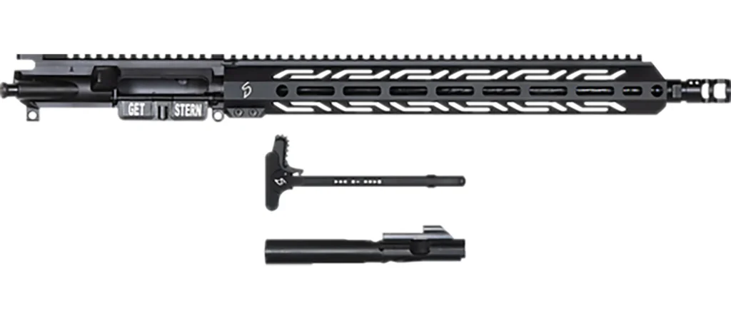 Includes: Stern Defense 15 inch M-LOK rail(Barrel nut, bolts etc.) Stern Defense 16.1 inch 45acp barrel. SD CB45 COMPENSATOR BREAK. Stern Defense assembled upper receiver 45 with dust cover and forward assist. Stern Defense SD BU45 Glock cut bolt. SD CH1 enhanced charging handle.