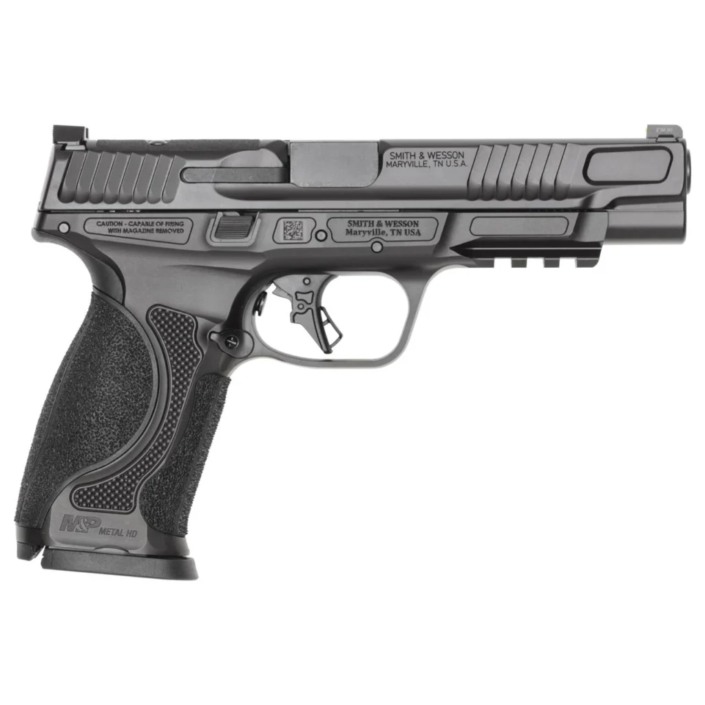The next evolution in the M&P line of handguns the Metal HD represents the ultimate heavy-duty pistol. Excelling in competition or any situation that requires repeatable accurate shots on target the Metal HD dominates the field. Combining a stainless steel frame with new texturing a 5” stainless steel barrel and more positive slide serrations this pistol melts into your hand and balances like an extension of your arm while also providing positive purchase on the slide for easy racking. The Metal HD is the perfect package yielding nothing but the best shooting experience of any M&P yet.