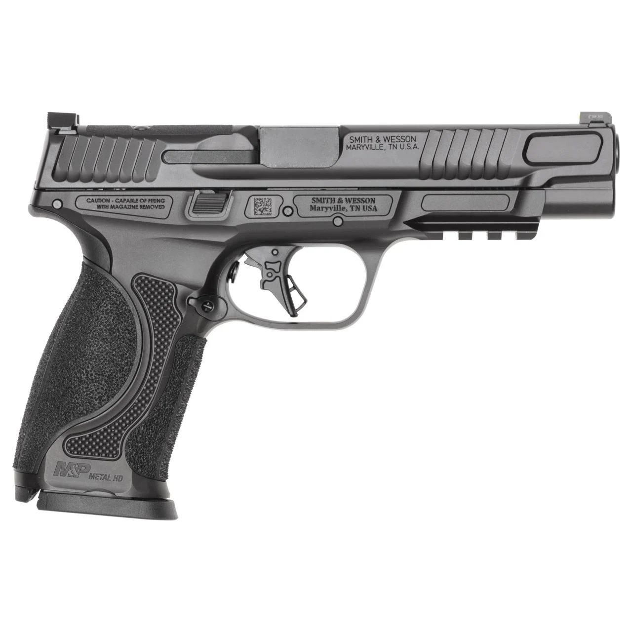 The next evolution in the M&P line of handguns the Metal HD represents the ultimate heavy-duty pistol. Excelling in competition or any situation that requires repeatable accurate shots on target the Metal HD dominates the field. Combining a stainless steel frame with new texturing a 5” stainless steel barrel and more positive slide serrations this pistol melts into your hand and balances like an extension of your arm while also providing positive purchase on the slide for easy racking. The Metal HD is the perfect package yielding nothing but the best shooting experience of any M&P yet.