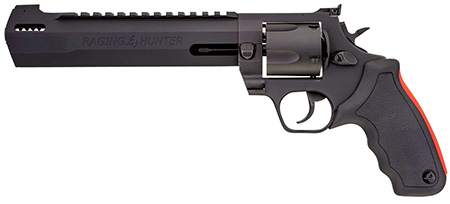 The Raging Hunter in a 500 Magnum. The 500 Magnum Raging Hunter features custom barrel ports to help reduce the recoil of 500 Magnum; target crown barrel enhances accuracy for precise shots; top Picatinny rail for mounting optics and accessories; unfluted cylinder increases weight and helps reduce recoil; cushioned grip provides maximum surface contact area and the Taurus double lock system keeps the cylinder secure when firing the heaviest of magnums.