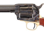 Taylor’s & Co. Model 1873 Cattleman single-action is a classic western six-shot revolver. It is manufactured using the highest quality standards available. The frame is forged which results in better grain structure and strength, making it ideal for competitive shooting. The Ranch Hand is built on the cattleman new model forged frame. It features all the best qualities of the cattleman design while boasting the flashy brass backstrap & triggerguard. Besides the brass grip frame, the Ranch hand features a case hardened frame with the remaining blued steel parts, and a smaller Navy-size walnut grip. This 45LC model has a 4.75″ barrel with blued finish, case hardened/brass frame, and blued cylinder. It is Taylor Tuned which features hand polishing and lighter hammer/trigger pull with custom springs.