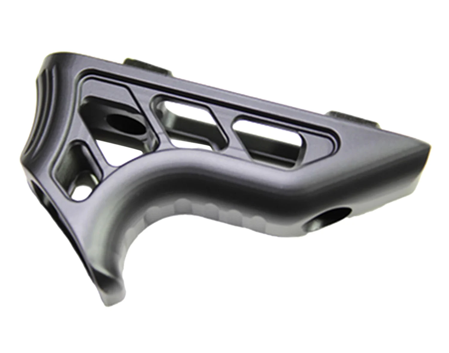 This grip will mount to any US manufactured KeyMod system. Used as a hand stop when shooting with the thumb over/forward method, this angled foregrip allows you to control your muzzle when rapidly moving from target to target. CNC machined out of aircraft grade billet aluminum. Weighs under 1.5oz.