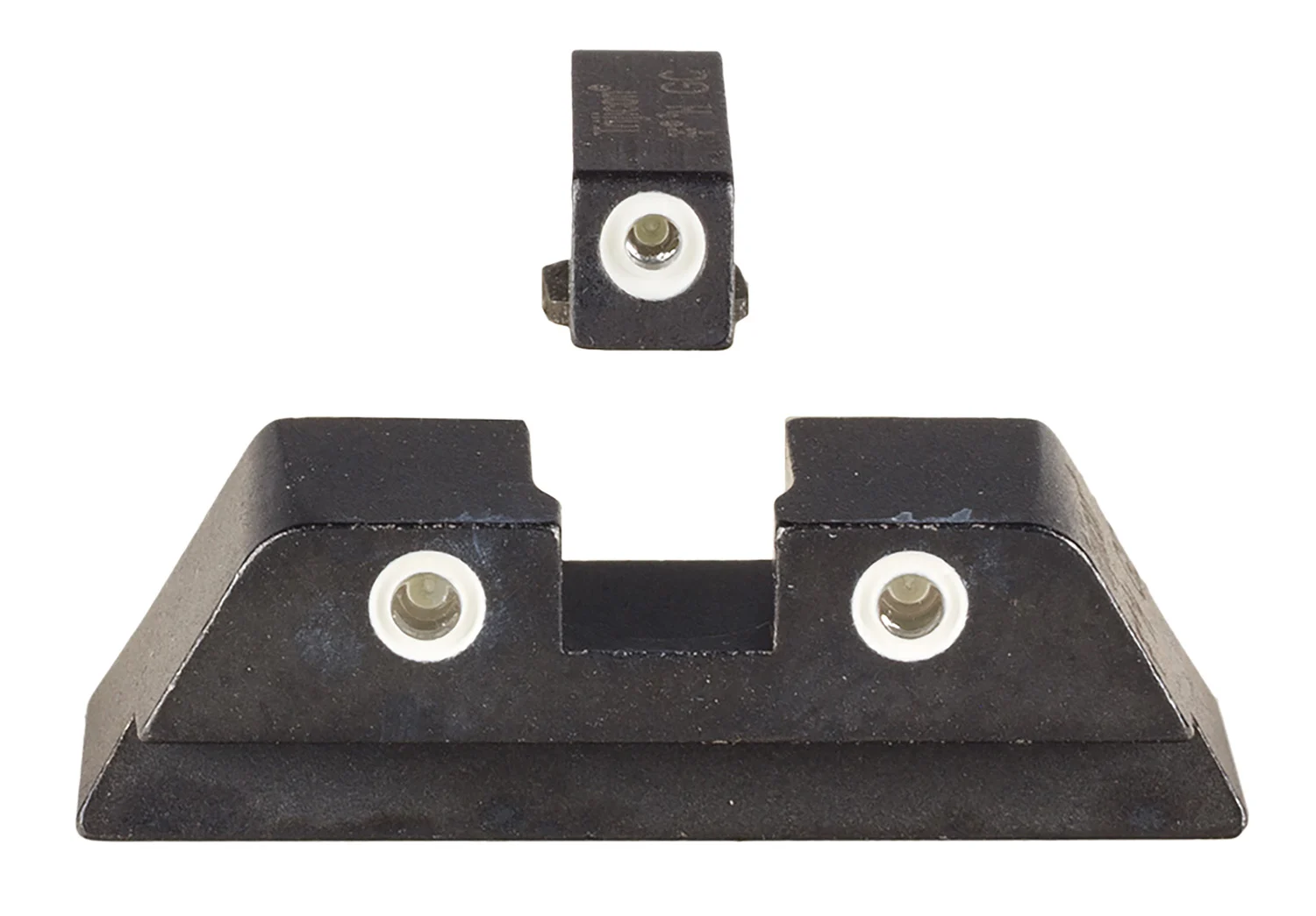 Trijicon Bright & Tough Night Sights are three-dot iron sights that increase night-fire shooting accuracy by as much as five times over conventional sights. Housed in a metal body and cushioned within silicone rubber, Bright & Tough Night Sights feature a unique shock-resistant design. Each lamp is capped with a sapphire jewel to help evenly distribute the light while protecting the lamp from solvents and puncture. Contained within aluminum cylinders for additional protection, the lamps are mounted on silicone rubber cushions to withstand shock and heavy recoil.